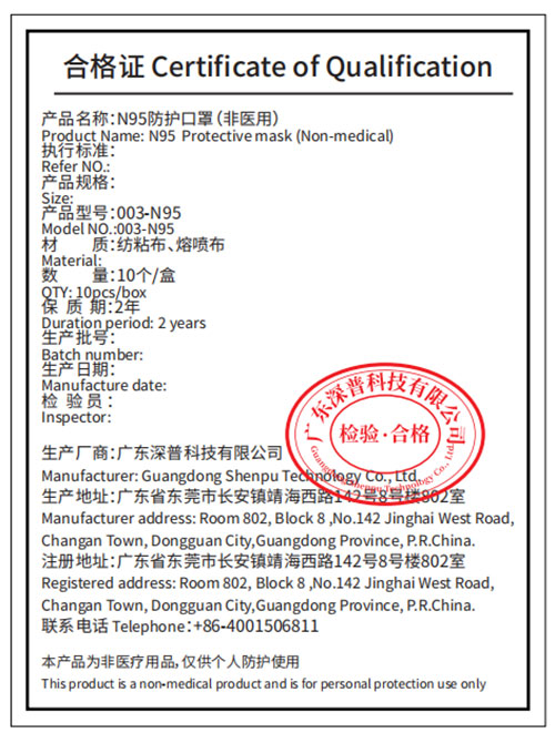 N95 หน้ากากป้องกันรูปร่างถ้วย‰ - ใบรับรองคุณภาพ